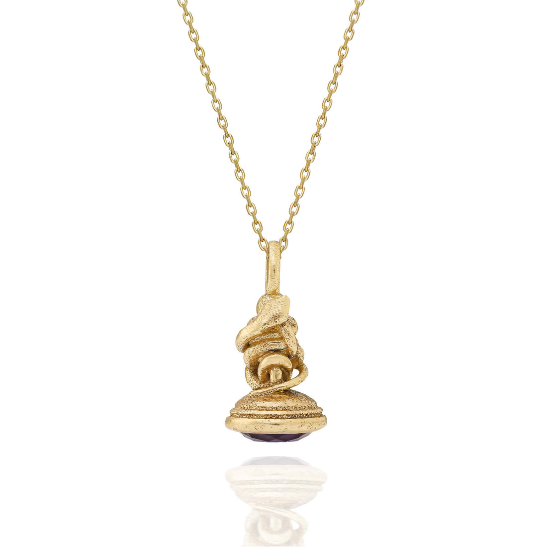 Embrace mystery and elegance with the Serpent Seal Purple Necklace, a striking statement piece offered...