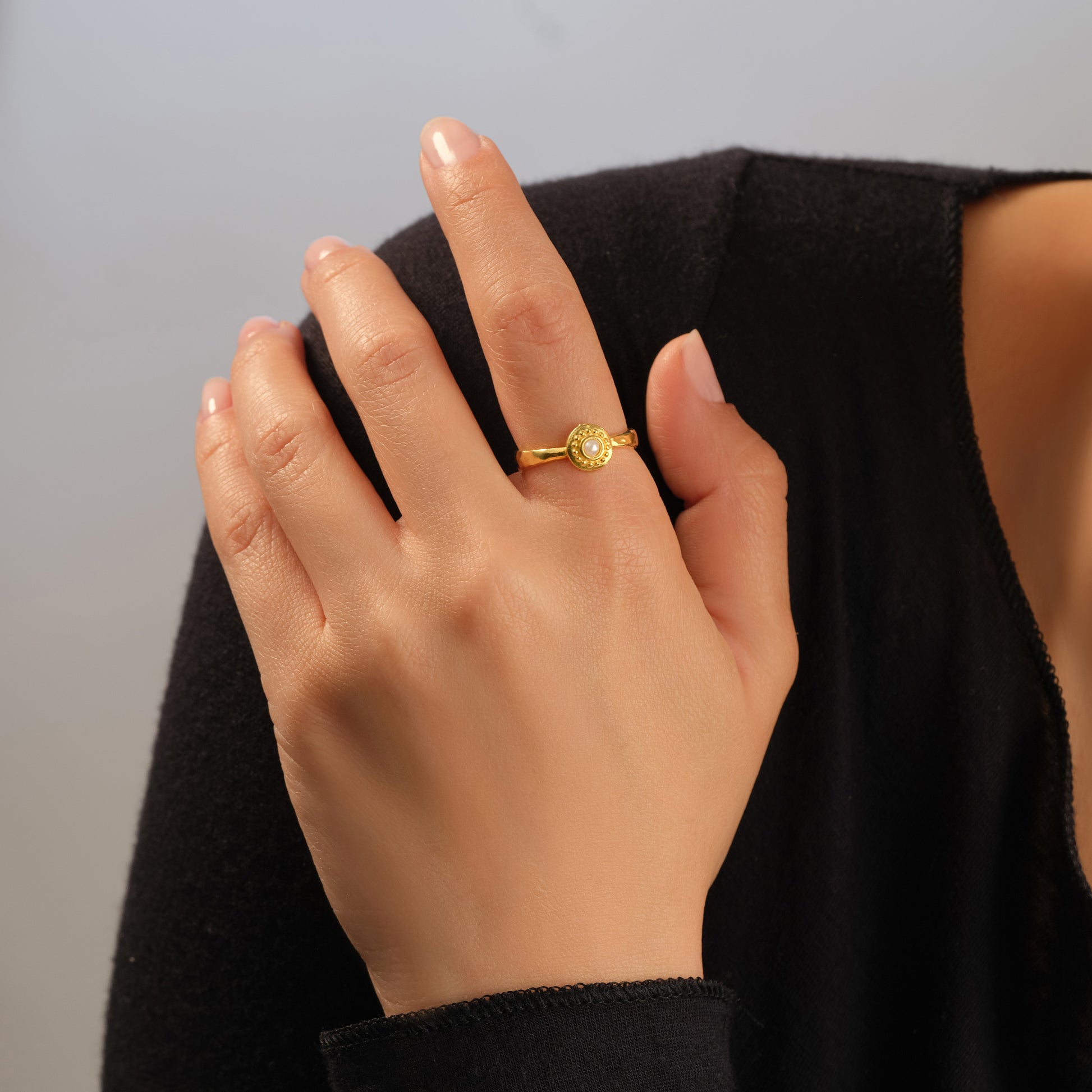 A soft, radiant gemstone sits at the heart of each piece, adding subtle glow and timeless sophistication.