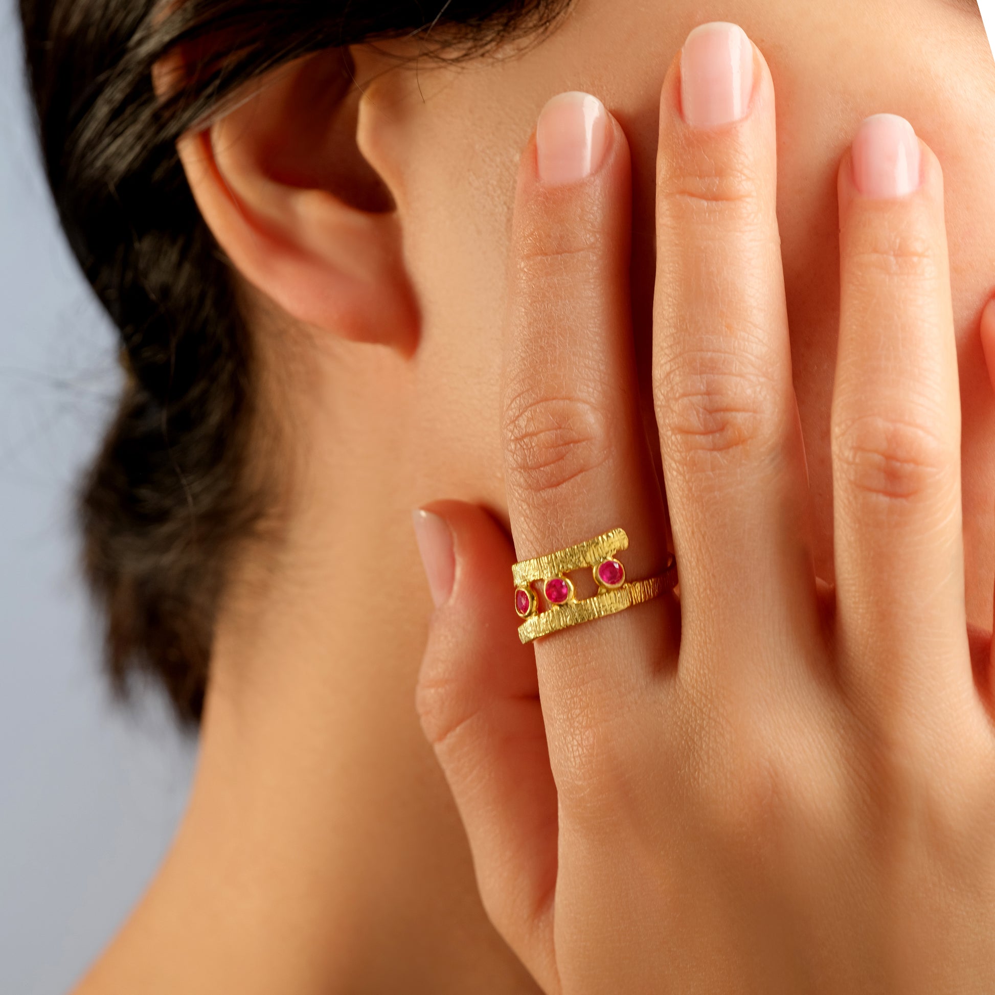 Make a bold yet elegant statement with the Rivara Triple Red Gem Ring, crafted in lustrous 925 sterling silver and enriched with radiant gold plating. Featuring a contemporary double-band silhouette, this striking design showcases three vivid red gemstones set along a sculpted, textured surface—offering a perfect balance of modern symmetry and artistic craftsmanship.