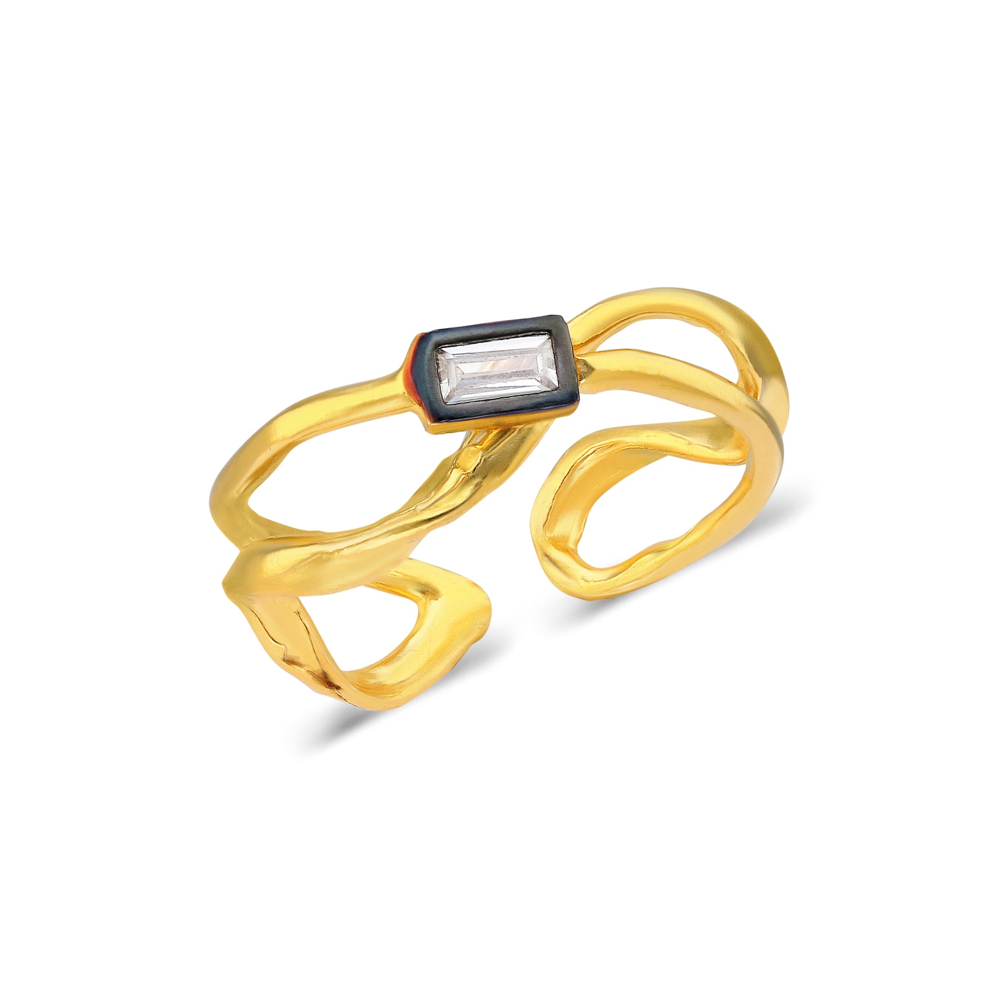 Explore modern artistry with the Vesper Noir-Baguette Open Ring, crafted in lustrous 925 sterling silver and enhanced with radiant gold plating. This sculptural design showcases an organically shaped open-band silhouette—balanced by a sleek rectangular baguette stone framed in a signature darkened bezel. The contrast between fluid lines and sharp geometry gives the ring a refined, contemporary edge.